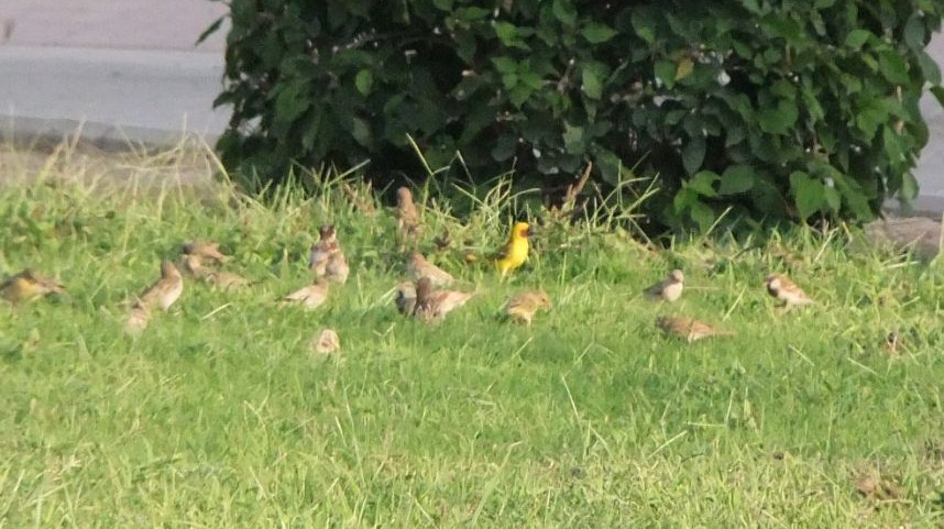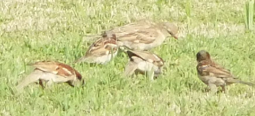 スズメの学校。沢山スズメが群がっています。でも少し変。ちょっと黄色いんじゃないの?顔も黒いし。お前もスズメなの?っていうのが混じっていることがあります。スズメと団体行動をとり完全に一員になりきっています。この鳥の集団も(小集団)も見たことはありますが、たまに一匹、二匹がスズメの大群に混じり同化しています。
