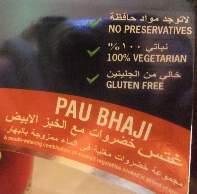 PAU BHAJI のアラビア語の説明は غتس خضروات مع الخبز الابيض とあります。グールグルの翻訳サイトで訳すと 「白パンとゲッツ(غتس)野菜」 ゲッツ野菜って何?何かが間違っているんでしょう。