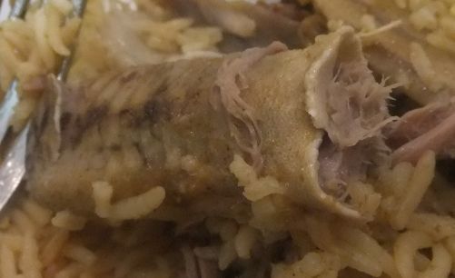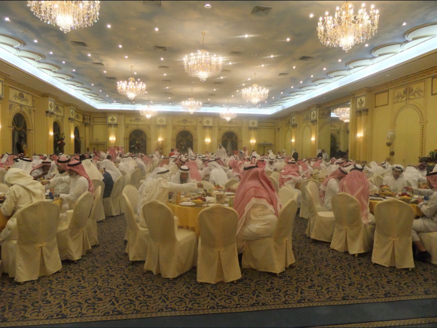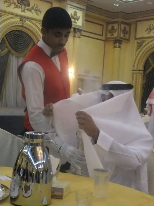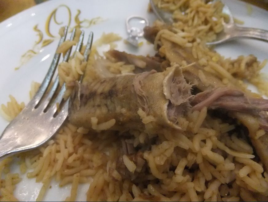 まん中に羊の頭がのっかっています。今回は羊の肉がどんとのっかっているタイプでなく、細かく切り分けられご飯に混ぜられていました。食べ方も手で直接ではなく、取り皿にご飯と肉を取り、ホーク、ナイフ、スプーンを使って食べました。お肉は柔らかくご飯もおいしかったですが、カプサは手で食べる方が好きです。スプーンなどで食べると金属の冷たさが感じられます。どうやらかなりサウジ化されてきたようです。