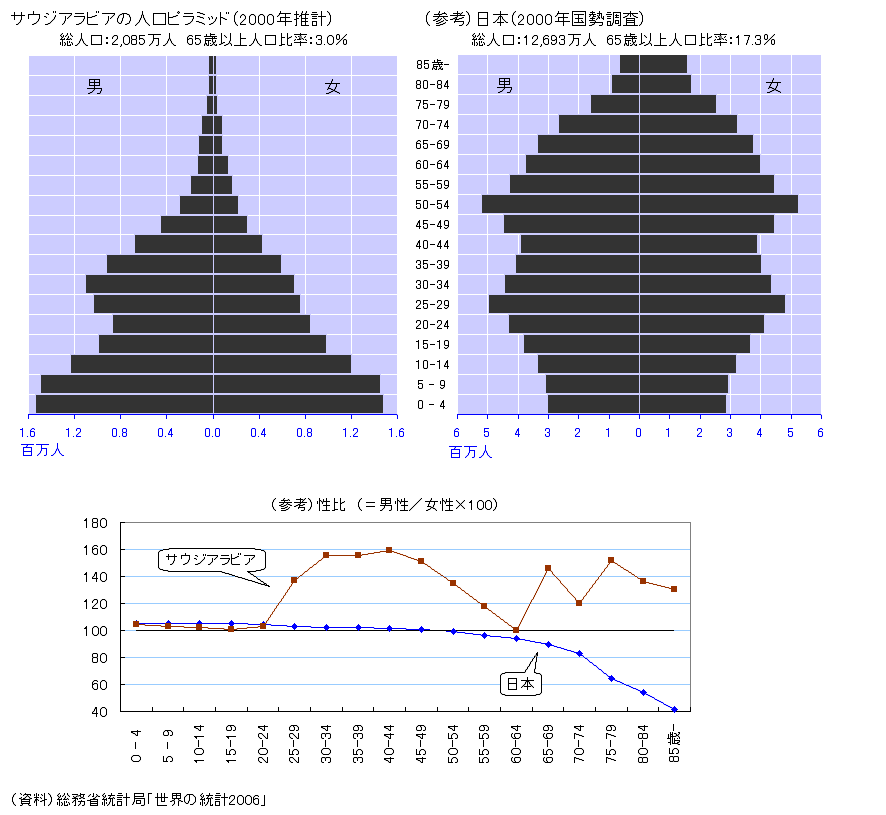 http://ecodb.net/exec/trans_image.php?type=WEO&d=LP&s=1980&e=2011&c1=SA からデータ、図を頂きました(再利用可とのことです。) http://www2.ttcn.ne.jp/honkawa/9310.html 人口ピラミッド 転載可とのことでしたので、転載させていただきました。働き盛りの男性が膨らんでいるのは外国人労働者を含むためです。 他の湾岸諸国と比較しました。