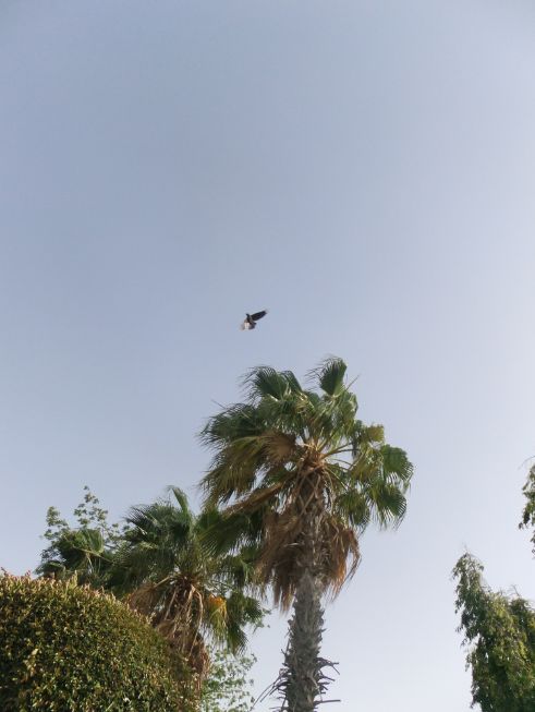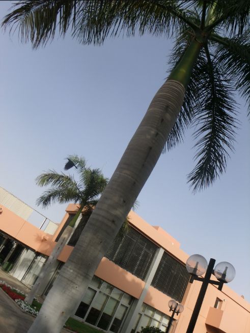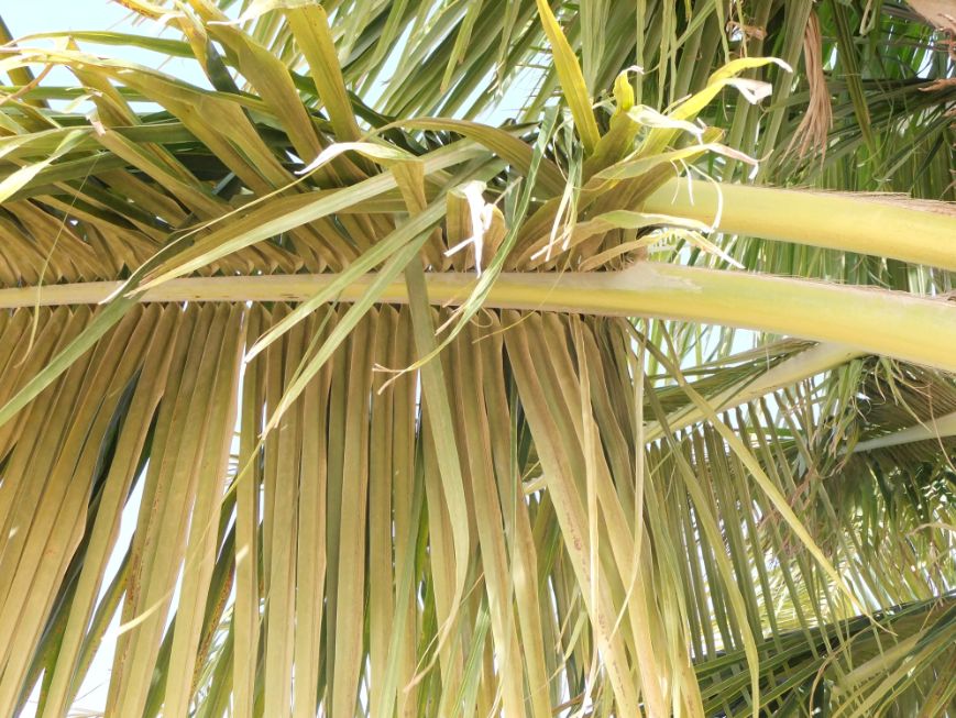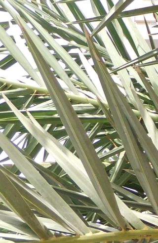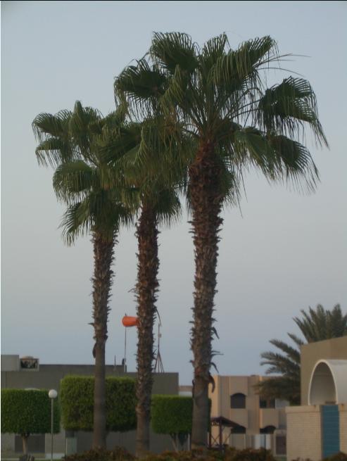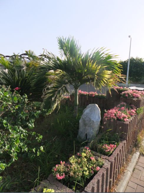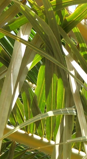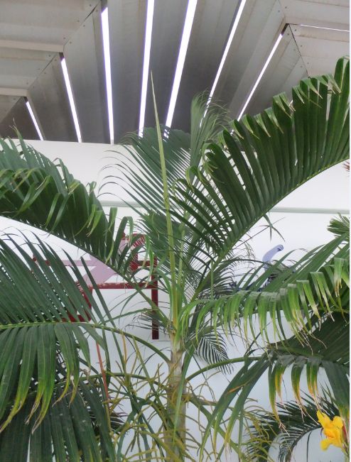 これらが同じ種類のヤシなのか違う種類か良くわかりません。葉の大きさ(横幅)などが微妙に違う気もします。 このヤシは上3枚とは異なります。葉の生え方も違うし、一本だけでなく数本まとまって生えています。前回紹介したクラウンシャフトを持つ花の咲いている小さなヤシ(違うところに植わっています)と同じ種類だと思います。 |