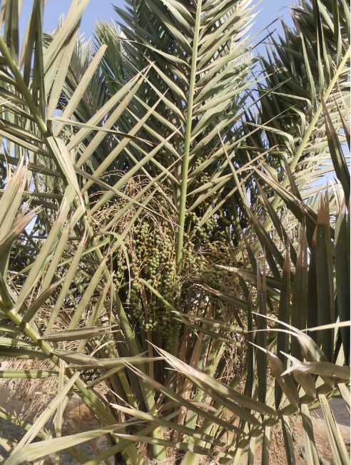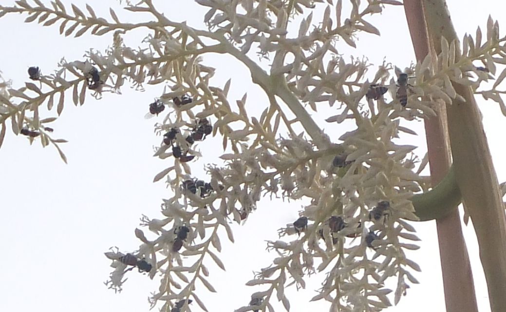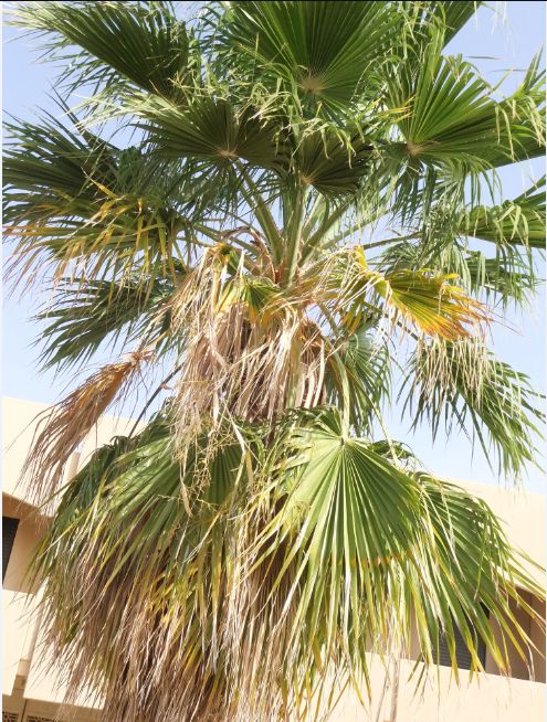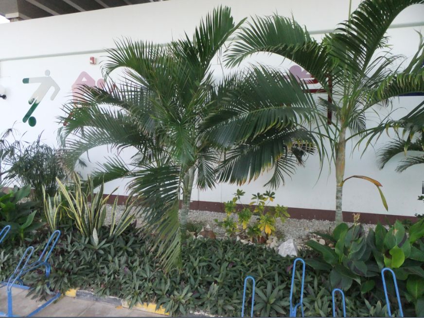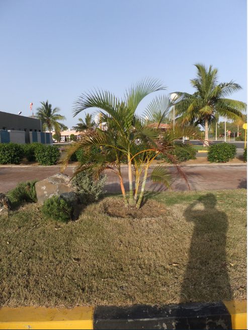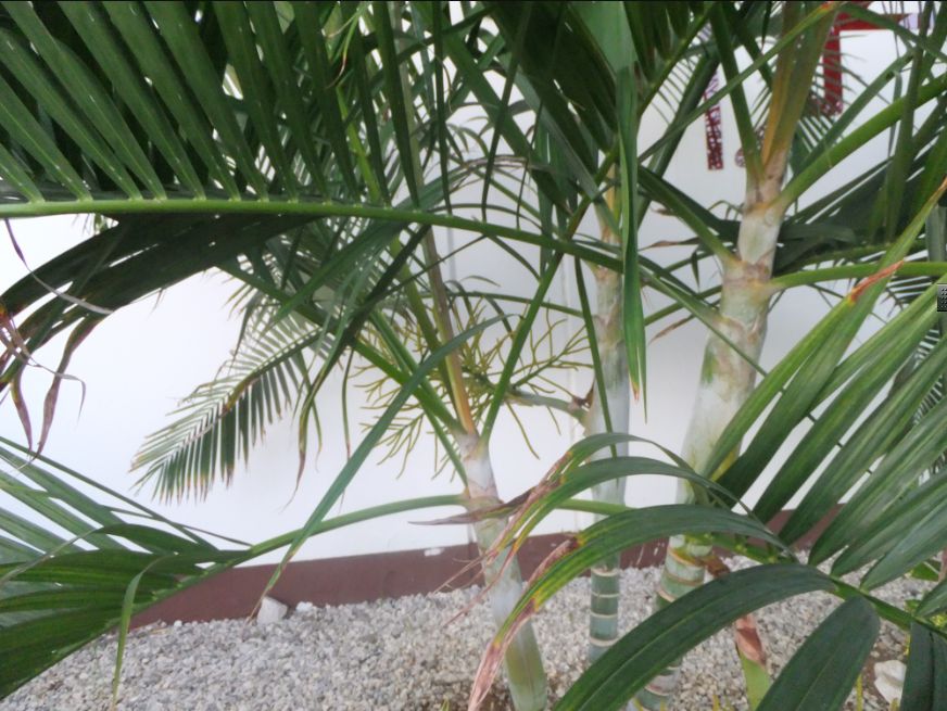 クラウンシャフトのある人の背丈より少し小さなヤシが何本か同じ一画に植わっています。