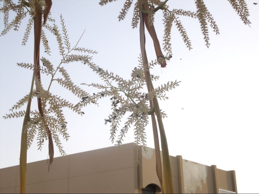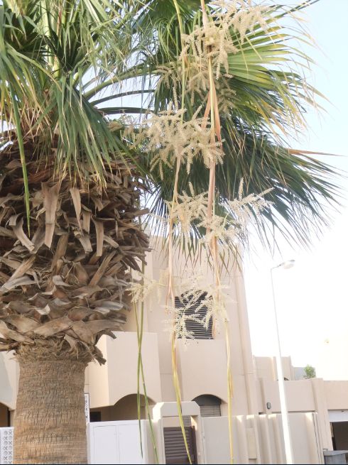 掌状葉のヤシに花が咲いていました。一つ一つは白い小さな花ですが沢山のハチが来て蜜を吸っています。一本の木に花が入った鞭みたいなものが伸びている段階、そこから花が出てきたところ、すでに実になているところなど色んな段階を一度に見ることができました。