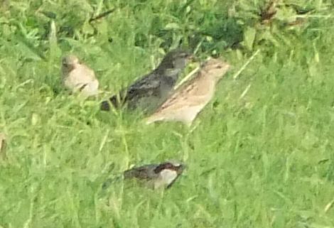 まん中に写っているスズメは周りのスズメより大きく見えます。だけど手前のスズメは草に隠れよく見えないし、奥のスズメも草に入り後ろに居ているので小さく写っているのかもしれない。たぶんこのオス・メスは他のスズメと変わらない大きさでしょう。